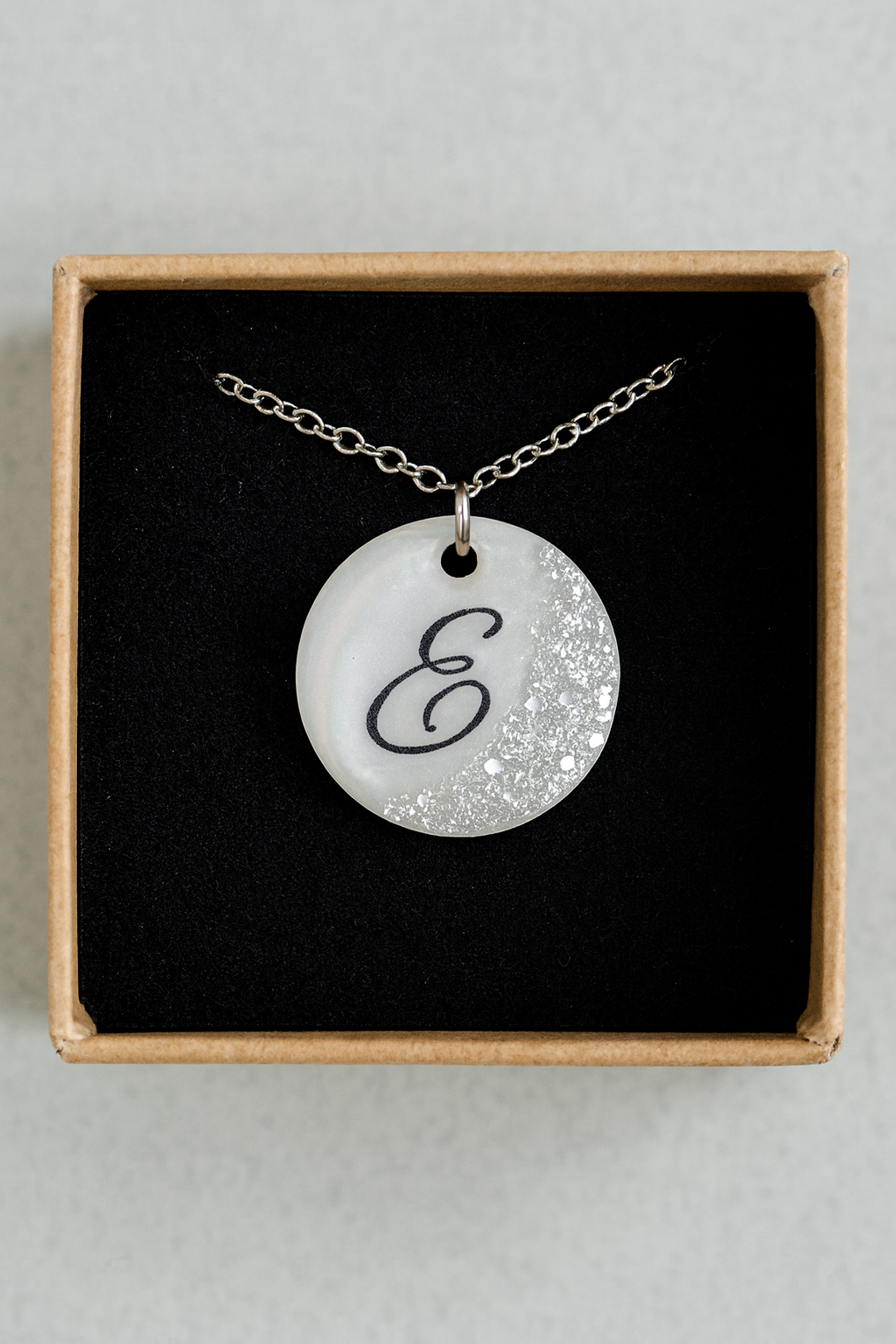Un’iniziale che parla di te, custodita nella trasparenza della resina e abbracciata dall’acciaio e decorata con foglia argentata.