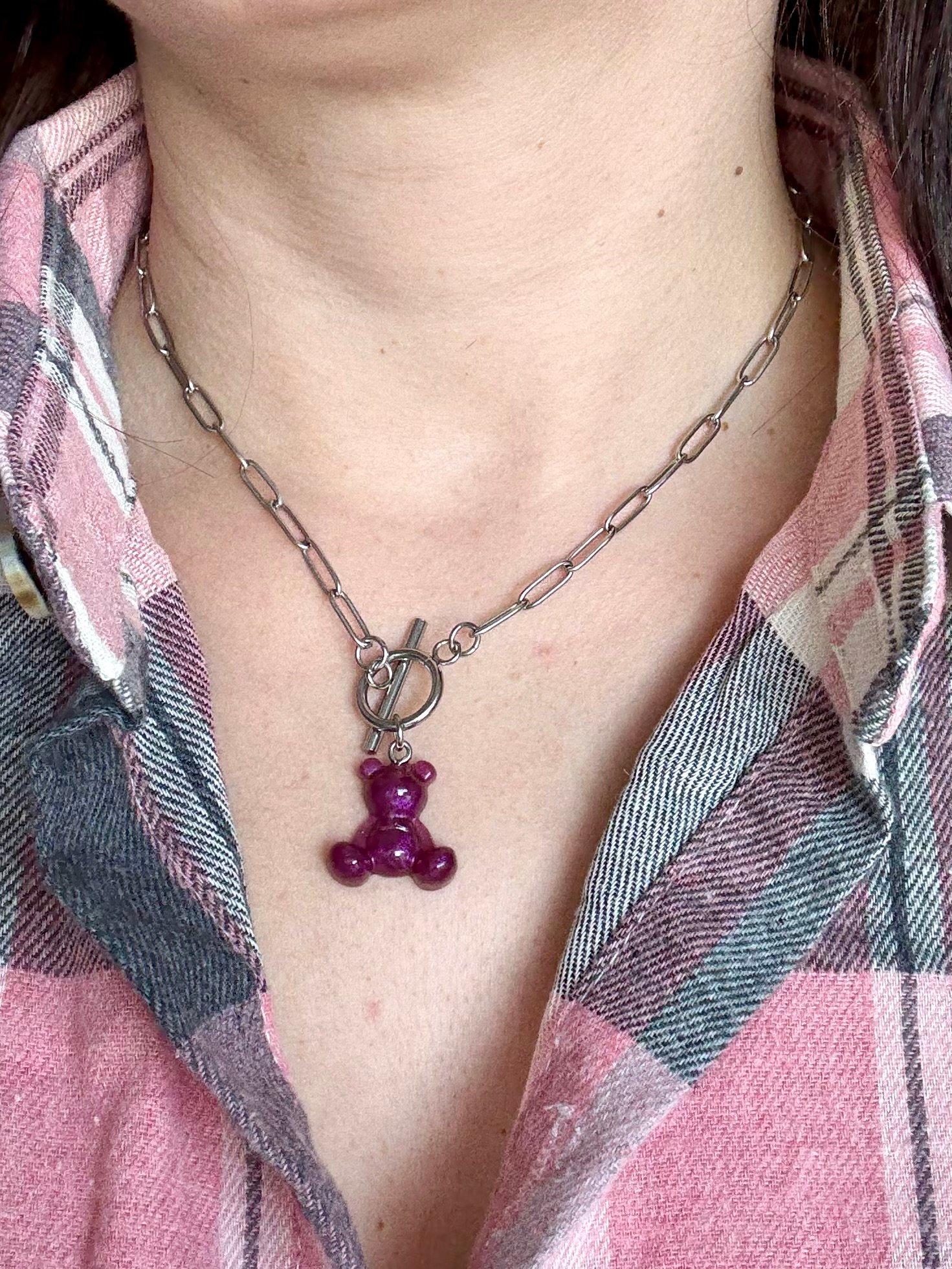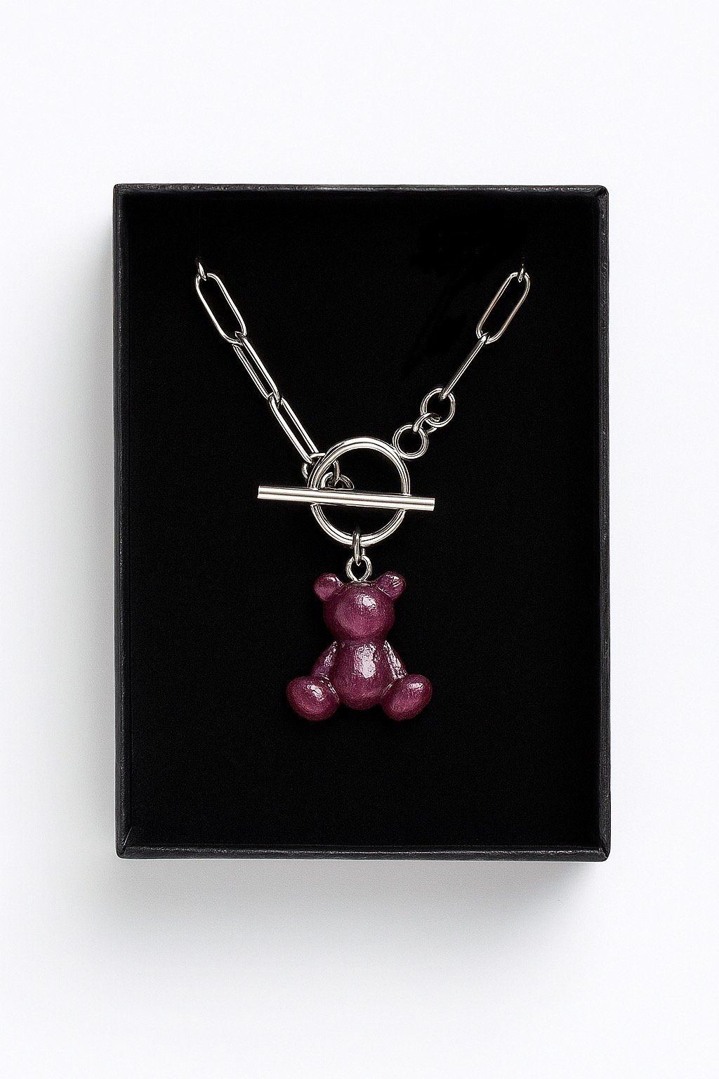 Ciondolo a forma di orsetto in resina bordeaux, con catena in acciaio.