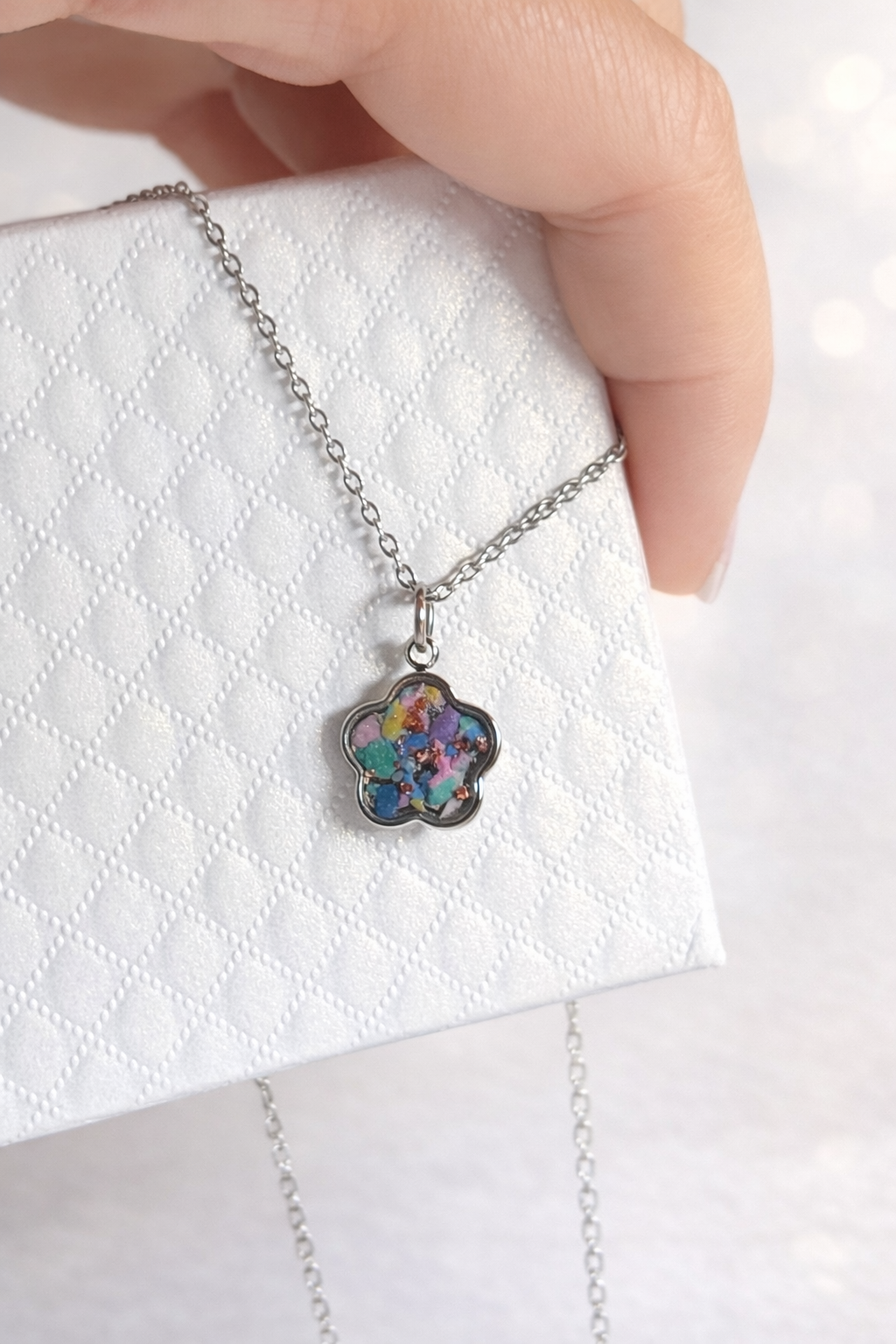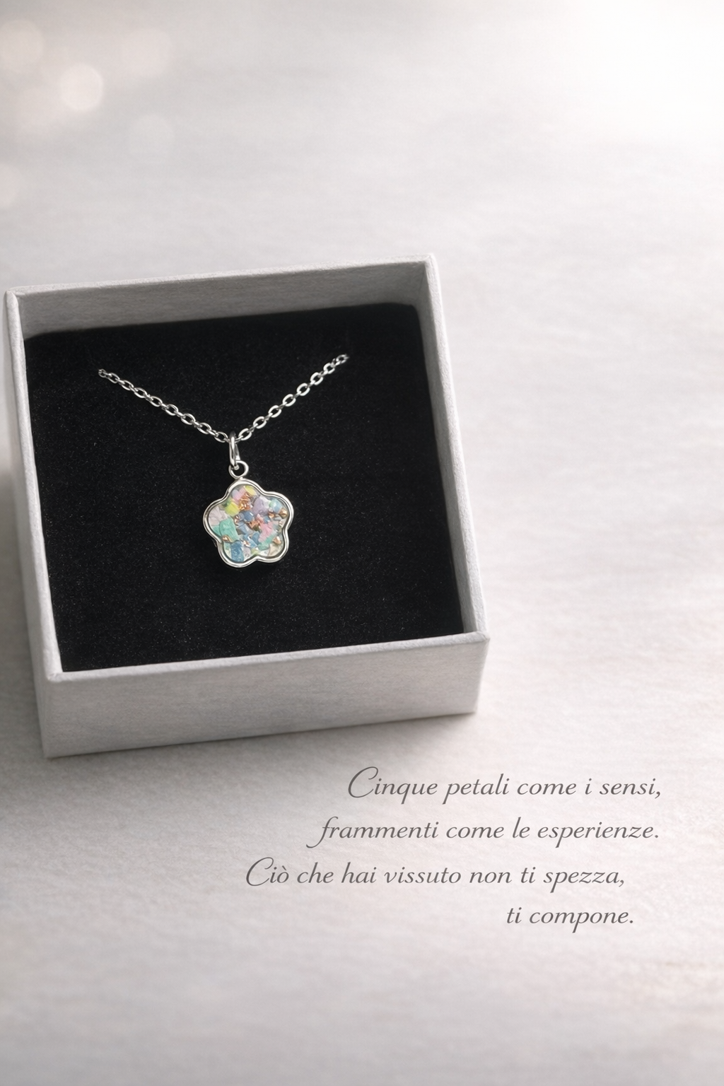 Il ciondolo, a forma di fiore a cinque petali, custodisce al suo interno materiali di recupero: piccoli frammenti selezionati (ceramica, resina e pietrine) e inglobati nella resina, trasformati in una nuova armonia.