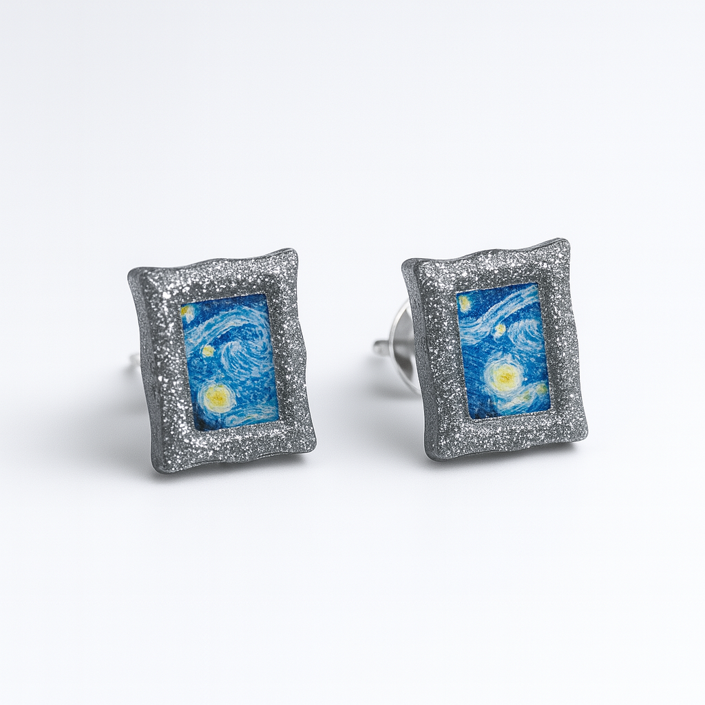 Porta un tocco d’arte sempre con te con questi eleganti orecchini ispirati alla celebre “Notte Stellata” di Van Gogh. Realizzati a mano con una cornice in resina e base in acciaio inox, sono leggeri, resistenti e perfetti anche per le pelli più sensibili.