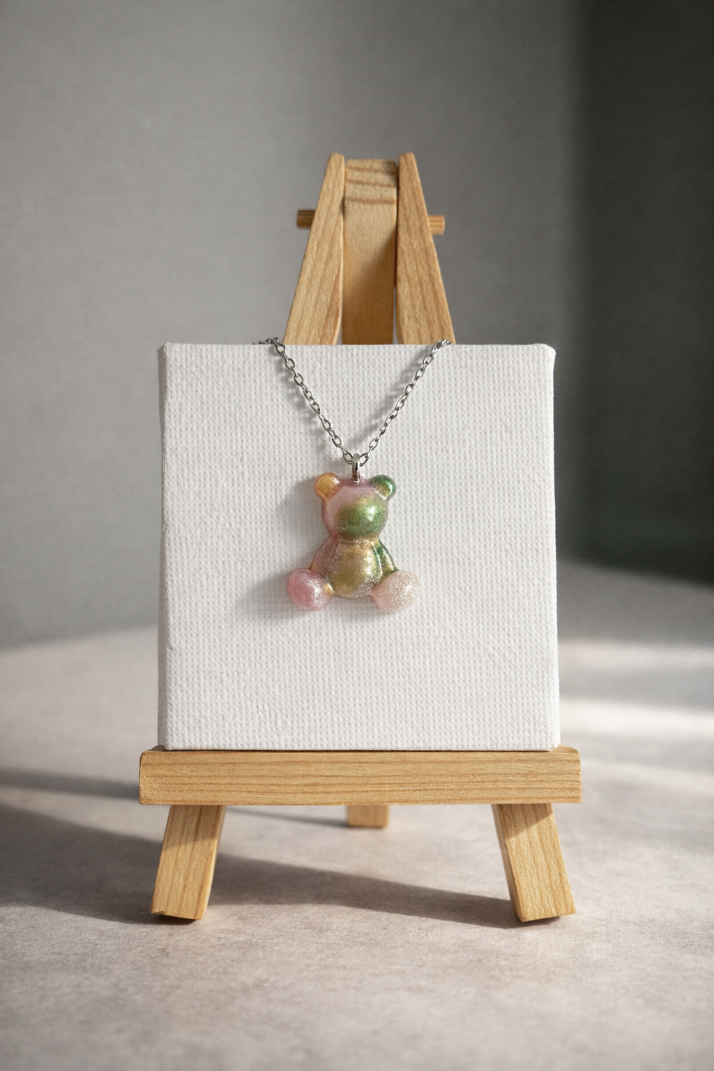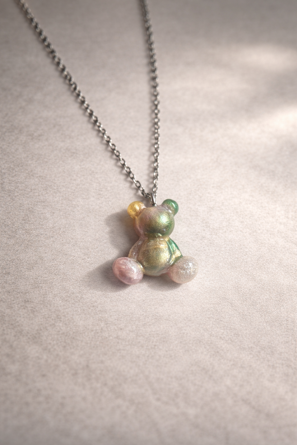 Ciondolo a forma di orsetto realizzato in resina, con riflessi iridescenti che cambiano alla luce: rosa e bianco tenue, oro caldo e verde delicato si fondono in un effetto cangiante, unico in ogni pezzo.